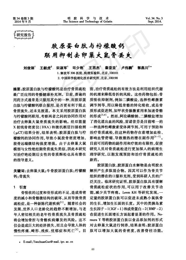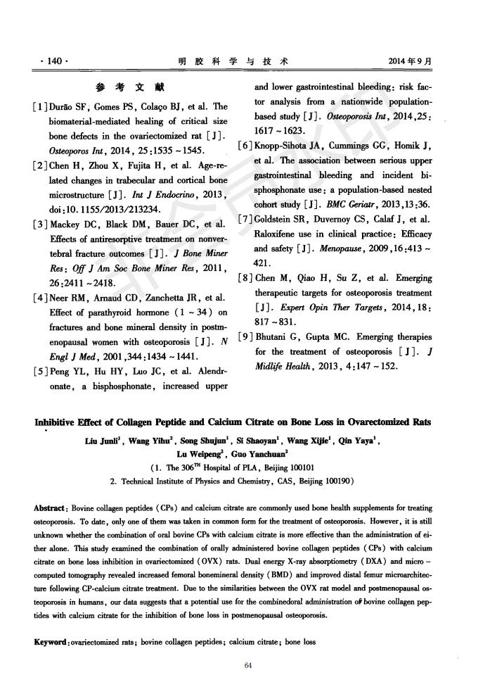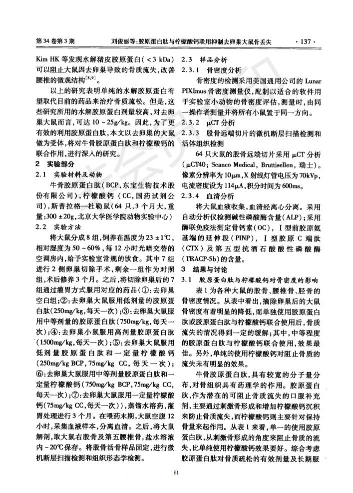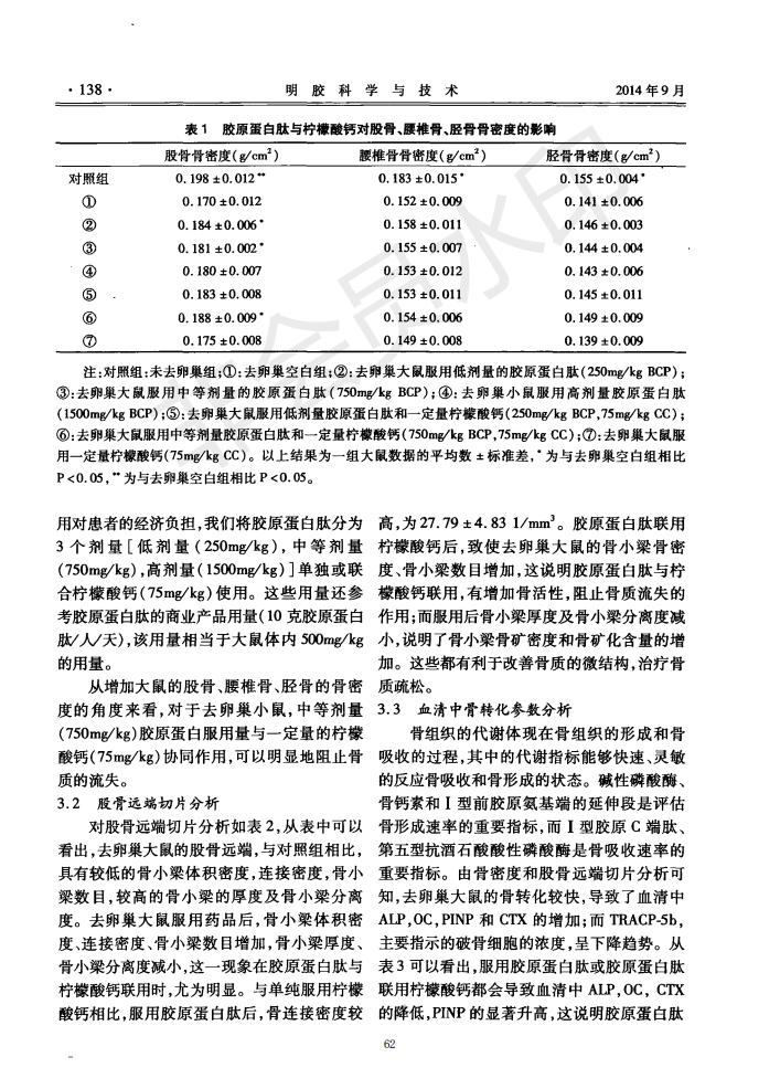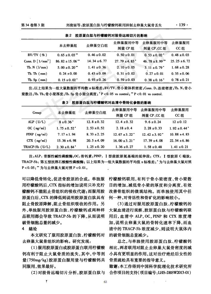胶原卵白肽与柠檬酸钙联用抑制去卵巢大鼠骨丧失