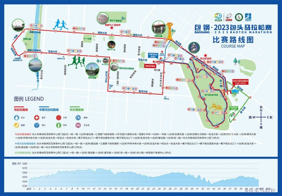 圆素提醒:包头马拉松赛将于6月23日7点30分开跑,,,,,,所有参赛选手领取物料时间为6月20日(周二)9:00 — 18:00、6月21日(周三)9:00 — 18:00、6月22日(周四)9:00 — 21:00,,,,,,所在为包头奥林匹克体育中心(北门),,,,,,角逐蹊径图如下: